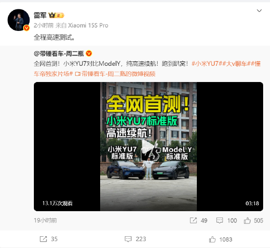 新浪科技讯 7月4日下午消息全国前三配资公司,小米集团创始人、董事长、CEO雷军今日在微博上转发汽车博主关于小米YU7对比Model Y纯高速续航测试的视频。